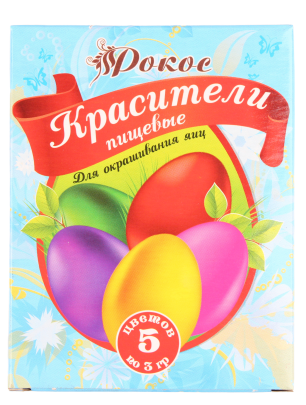 —Красители пищевые для яиц 'Рокос' 5 цв. (роз., красн., зел., жёл., фиол.), по 3 гр., в картон. уп.