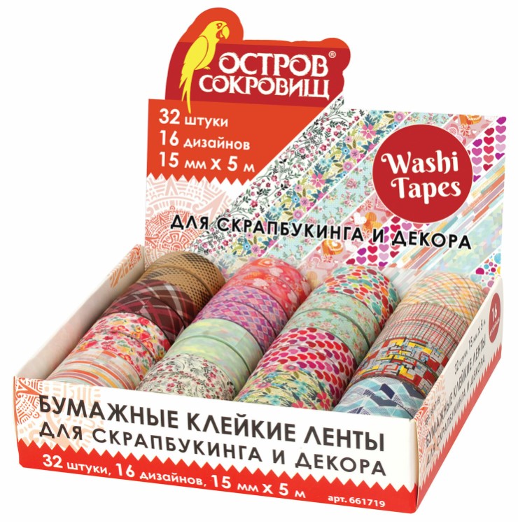 —Клейкая WASHI-лента для декора, 15 мм х 5 м, ассорти, в дисплее, ОСТРОВ СОКРОВИЩ, 661719